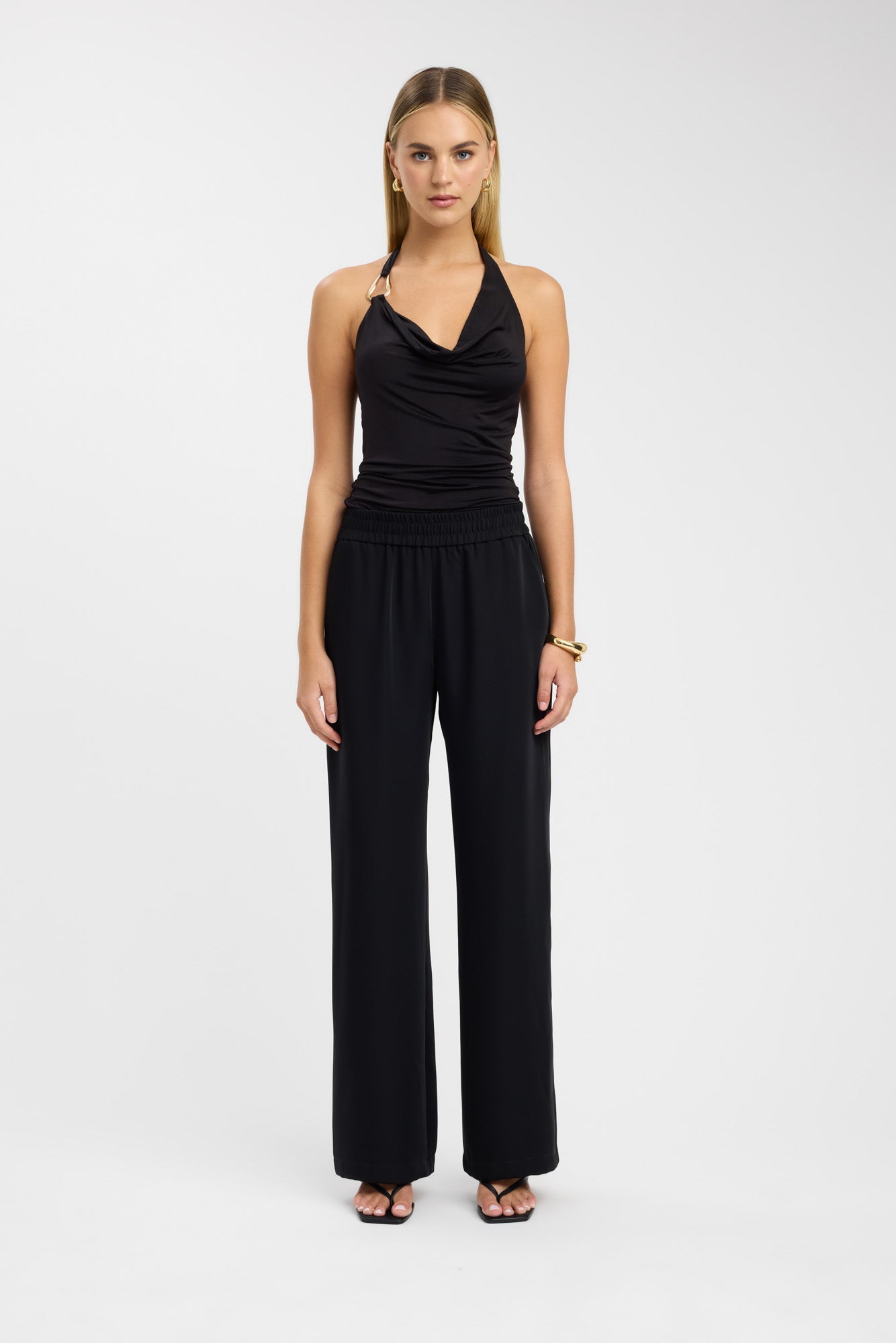 Elevate your style with our Char Cowl Top. The luxurious cowl neckline and halter silhouette exude sophistication, while the gold trim detailing adds a touch of opulence. Designed with a rouched finish and crafted from soft light jersey fabrication, this top is both comfortable and elegant.