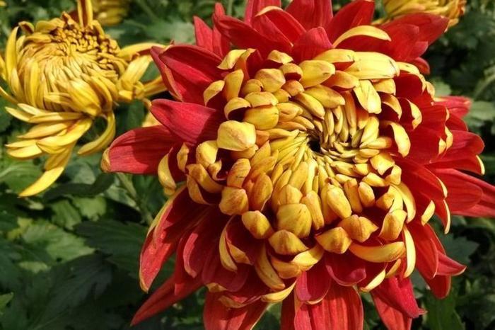 Gold-red Chrysanthemum is a precious variety of chrysanthemums, with flat petals. The front of the flowers is bright red and the back is golden yellow. The entire inflorescence displays ✨a bright and dazzling light✨, making it an excellent variety for potted plants, variety exhibitions, and commercial chrysanthemums.