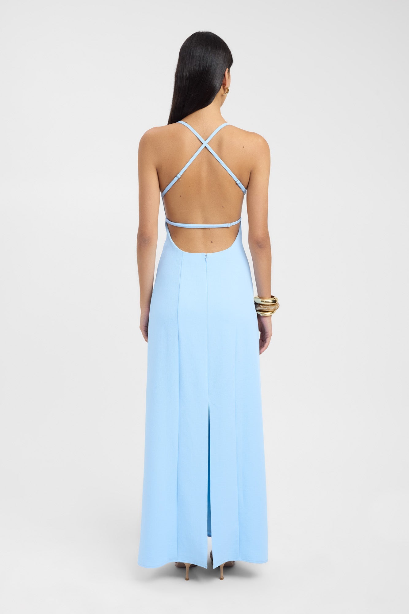 The Ariel Strappy Maxi Dress in Blue Sky is defined by its plunging V-neckline and sleek, minimalist silhouette. The fitted bodice flows into a straight floor-length skirt, while the open back with delicate cross straps adds a striking finish. A subtle back split ensures ease of movement, making it a versatile addition.
